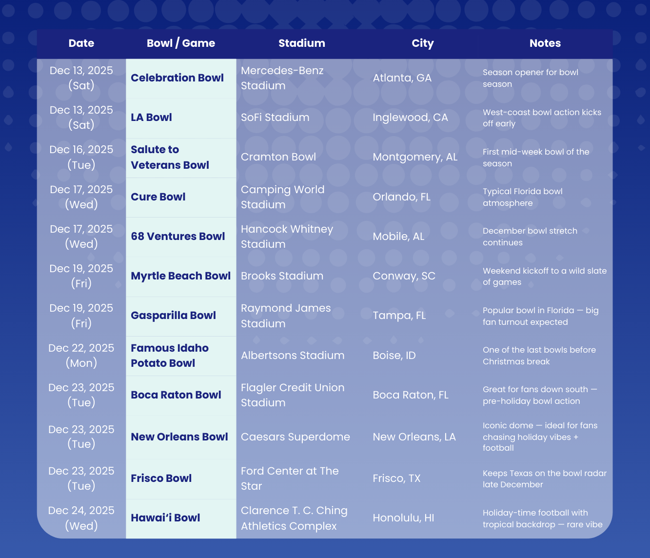 Bookmark this list before tickets drop. Bowl matchups can change based on conference tie-ins — but dates/stadiums rarely move.